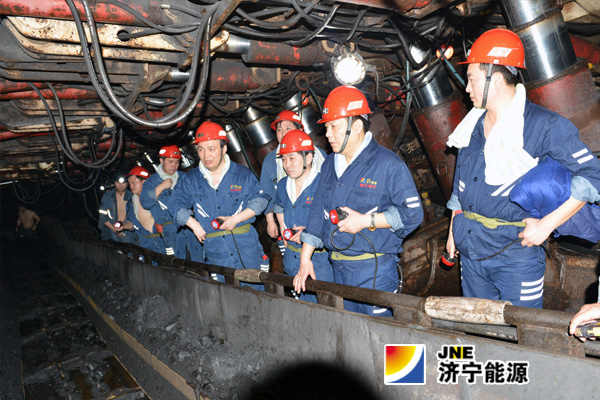 张广宇一行先后到该矿正在过变薄区的1306工作面和新开门的1308轨道顺槽了解生产情况。在生产现场,张广宇与陪同人员就变薄区的开采工艺,岗位承包、系统承包,跨区作业、优化人力资源配置,改善工作环境,降低劳动强度,提升劳动效率以及安全罚款、外委队伍管理等多方面问题进行了探讨,并提出了具体的指导性意见。要求现场跟班的综采二区区长张召强千方百计多出煤、出好煤,为提升企业效益做贡献。升井后,在该矿五楼调度会议室查看了图纸,与矿领导班子一起研究了今明两年的开拓布局、采掘接续及特殊条件下的开采方式和开采工艺。